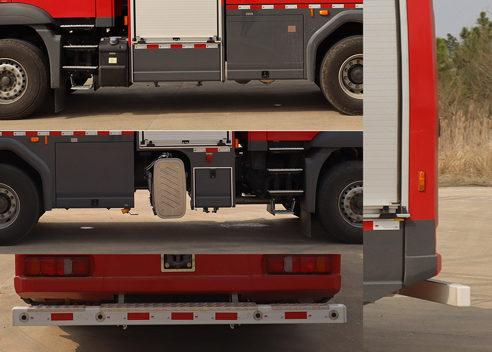 | 其他 | 水罐总容积:16.000立方米,为“凸”字型罐体,水罐前端尺寸:600×1400×1600mm,水罐后端尺寸:4090×2350×1600mm。整体式侧防护结构,后防护装置材料:Q235A,截面尺寸(宽×高):80×120mm,与车辆连接方式:螺栓连接,后防护离地高度:495mm,ABS生产企业为威伯科汽车控制系统(中国)有限公司,型号为4460046300。主要专用装置有消防泵、消防炮。 | ||