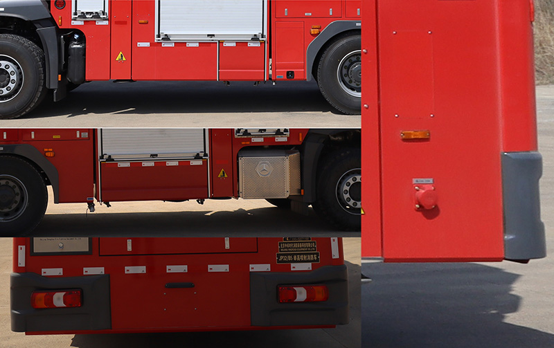 | 其他 | 罐体总容积:7.800立方米,水罐容积:5.200立方米,水罐尺寸:1700×2400×1300mm,泡沫液罐容积:2.600立方米,泡沫液罐尺寸:870×2400×1300mm。整体式侧后防护结构,后防护离地高度:500mm,前伸:380mm,后伸:180mm。ABS生产企业为WABCO,型号为EB5006。主要专用装置有臂架、消防炮。 | ||