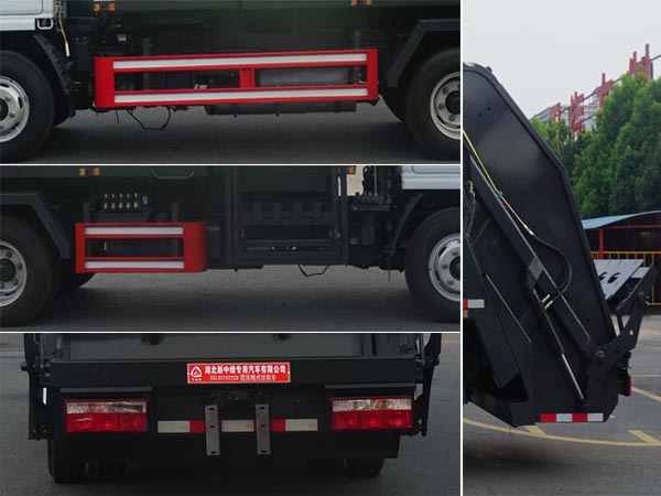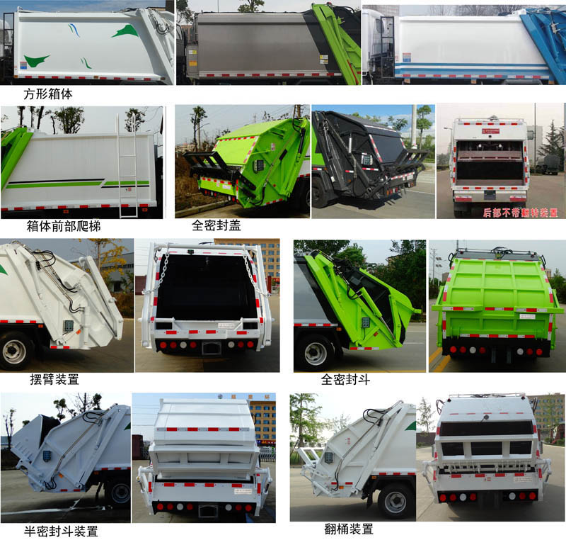 | 其他 | 该车型主要用于各类垃圾清理及运输,主要装置为压缩厢体及填充器.该车可选装方形或弧形车厢;选装后密封盖装置;选装爬梯;选装后部工作装置.选装翻桶装置及半密封斗装置时,后伸量为480(mm),对应整车长为6850(mm).选装翻桶装置及全密封斗装置时,后伸量为230(mm),对应整车长为6600(mm).摆臂装置时,后伸量为180(mm),对应整车长为6550(mm).选装无上料装置时,后伸量为0(mm),对应整车长为6370(mm).侧防护材料为Q235,连接方式为连接支架固焊在副车架大梁上.因后部结构需要后防护专用装置代替,离地高为400(mm).选装前面罩,前保险杠,前组合灯具.ABS型号/厂家:ABS/ASR-12V-4S/4M/襄阳东风隆诚机械有限责任公司.仅采用3308(mm)轴距底盘.发动机/油耗申报值对应关系为:CA4DB1-11E6/16.3,CY4BK161/16.2,CY4BK461/16.2,D20TCIF1/16.3,YCY24140-60/16.3,ZD30D16-6N/16.3. | ||