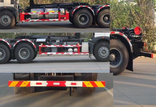 其他 该车选用底盘4350+1350mm轴距.该车通过拉臂装置及液压系统,实现对垃圾的装载及卸料的作业功能;侧面防护装置的材料为Q235A,连接方式为螺栓连接;后防护装置材料为Q235,与车辆连接方式为焊接连接;后部防护装置的断面尺寸为120×60mm,离地高度为500mm;该车安装具有卫星定位功能的行驶记录仪.选装限速装置,最高车速(km/h)为80或89.ABS系统控制器生产企业/型号为威伯科(上海)管理有限公司/4460046300;选装EBS,EBS系统控制器生产企业/型号为威伯科(上海)管理有限公司/EBS3。选装ETC车载装置